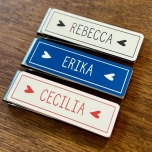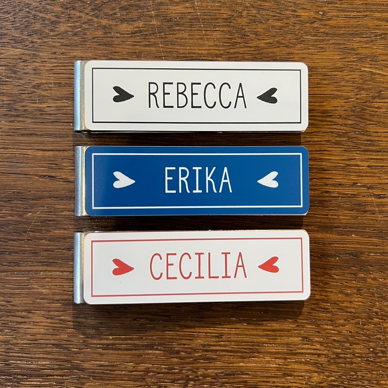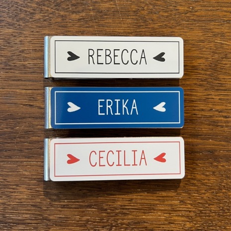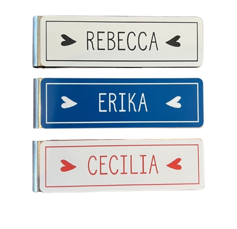 Namnskylt Rebecca är dekorerad med liggande hjärtan och ram runt namnet. Namnskylten går att få i flera olika färger där namnet och dekorationen graveras i materialet. Storlek: 8 x 2,5 cm. Meddela oss om du önskar magnet istället för klämma.