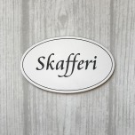 Tillverkad i plast med vit, blank yta och texten i svart gravyr. Mått: 11x6,6 cm. Dubbelhäftande tejp.
